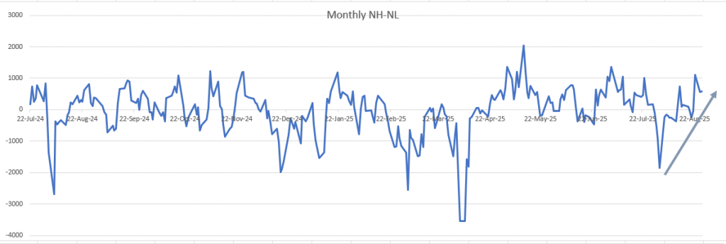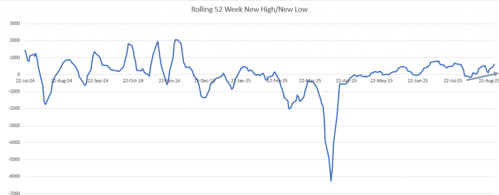 Could be nothing-we will see. The trend is stuck in a small range, but still up. Not much leadership at the moment. The rolling 52 week highs has ticked up, but still diminished. It would be nice to get a health pullback to jump in from. Nvidia reports earning after the bell tomorrow afternoon.