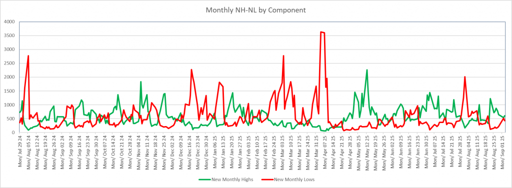 New monthly high expanded slightly and New monthly lows decreased. Not enough to think the rally will continue much longer. Also not enough to say the bears are going to take over.