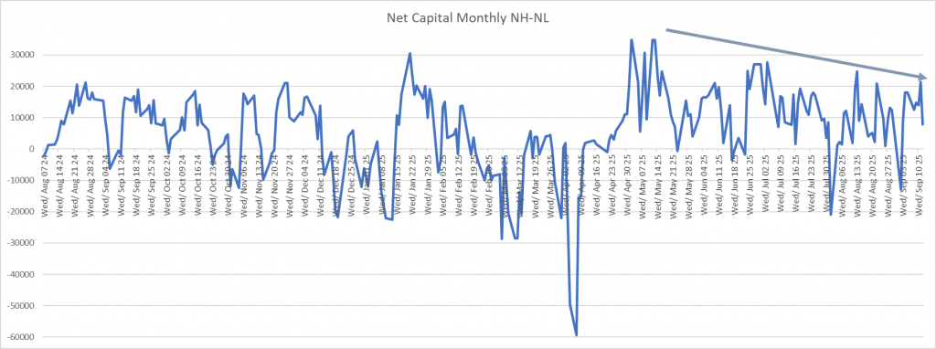 As the market moves higher, all the warning signs of a pullback are still there. The Net Capitalized NH-NL is still showing a bearish divergence.