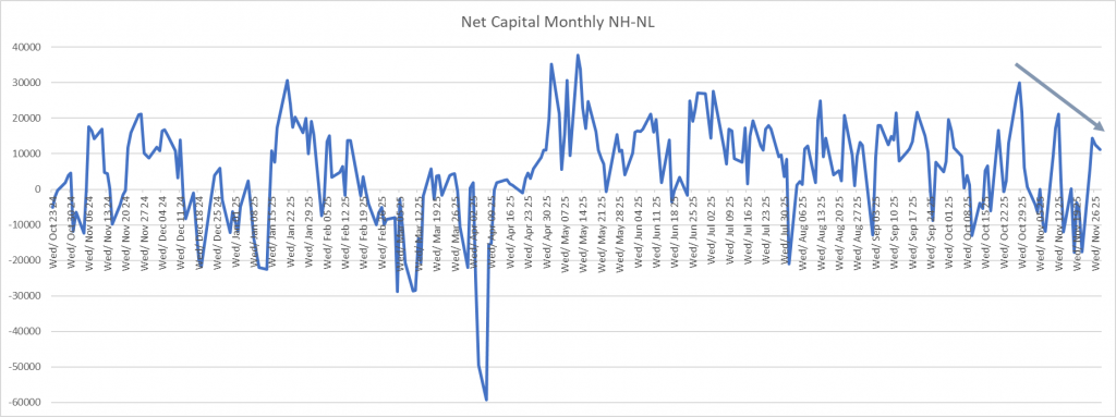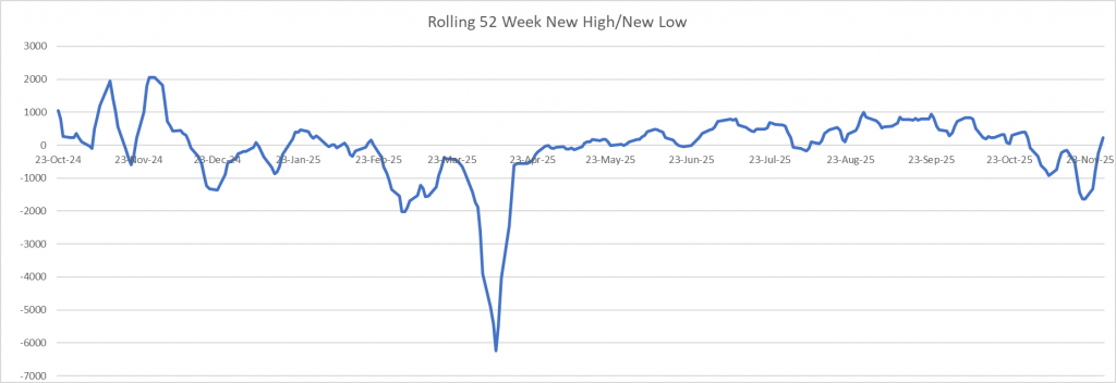 The AI bubble has thrown the normal seasonal gyrations off this year, so we will see what becomes of December this time around. The rolling 52-week NHNL has made its way above 0. It makes me think the rally has a good chance of continuing for a while.
