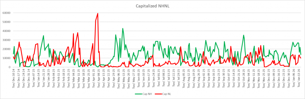 The most important driver of this market seems to be the Capitalized NHNL. The NH is stable and continues to bounce between the 15-30 trillion range. What is the biggest threat to the upward trend is the growing NL. It has been north of 10 trillion most days since the beginning of the year.
