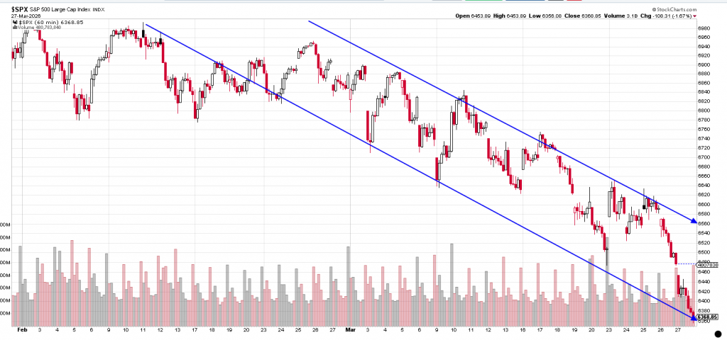 The market blew through support on Friday and did not look back. It is likely we will have a bounce of some kind early next week. On the hourly chart, the market is still following a very orderly descending channel that it entered into in late February. The market does not appear motivated to break this channel yet.