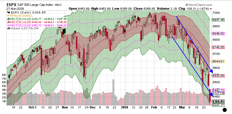 It seems like, at this point, the market has not found a bottom yet. The next level of support is around 6150. That was the high before Trump’s liberation day celebration sent things into a spiral last year. Coincidently (not really), that is also close to the -3 ATR on the weekly chart. That is a pretty healthy support point and I would think bulls will put up a fight there-if it does not recover before then.
